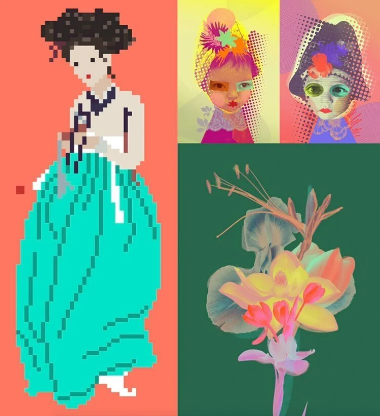 Her work explores the identity of the hybrid. Through various themes, she expresses the connection between the past and future, creating a unique edited world. Her work process includes connecting the future through pixels and expressing the world through collages.
